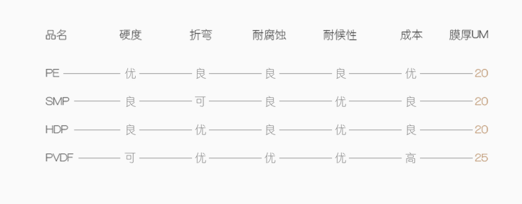 彩色鋼板最常用的面漆種類有:聚酯(PE),硅改性聚酯(SMP),高耐久性聚酯(HDP),聚偏氟乙烯(PVDF),每種面漆適應不同的情況,在經濟允許的情況下我們建議使用HDP或者PVDF的產品。