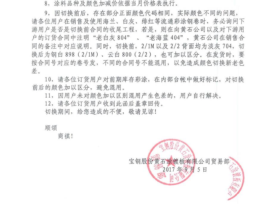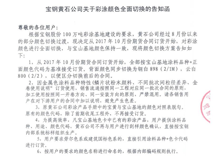 9月5日,寶鋼黃石發(fā)布了《寶鋼黃石公司關(guān)注彩涂顏色全面切換的告知函》,其告知函全文如下: