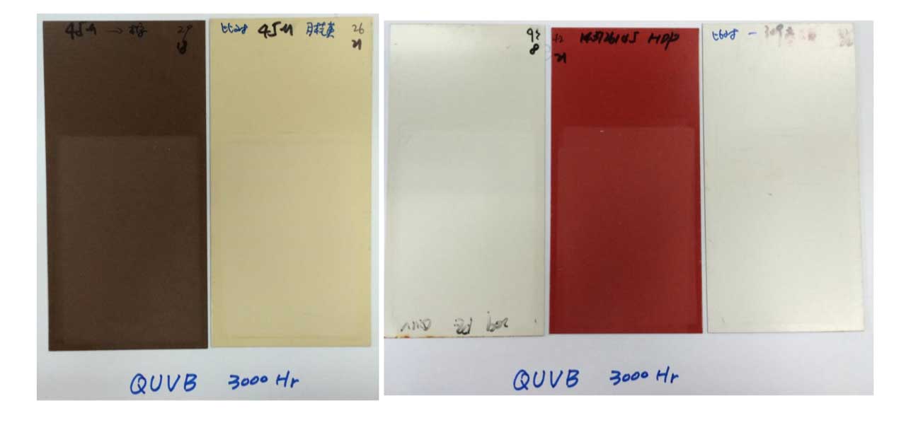 經(jīng)過3000小時(shí)QUVB試驗(yàn)后,45微米氟碳產(chǎn)品涂層粉化仍保 持0級(jí)。