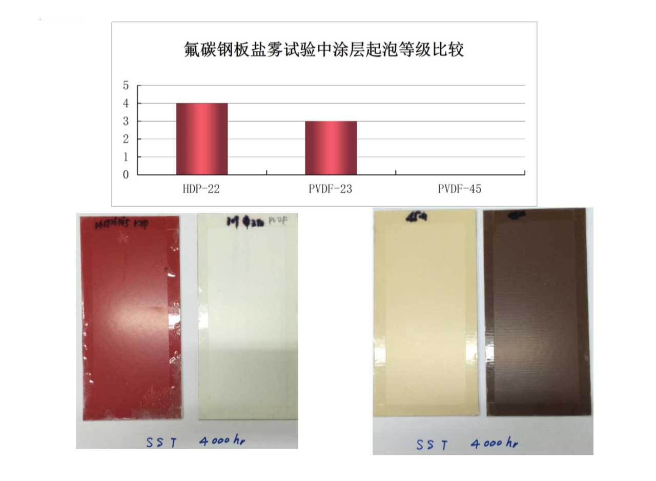 經(jīng)過4000小時(shí)鹽霧試驗(yàn)后,45微米氟碳產(chǎn)品涂層仍保持0級(jí)。