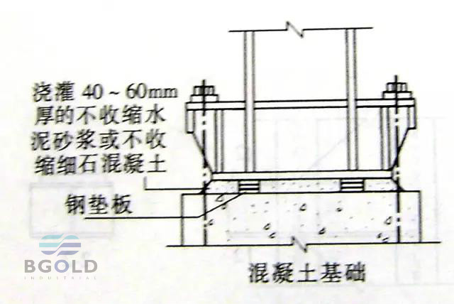 c.  墊板與基礎面應緊貼、平穩(wěn),其面積大小應根據(jù)基礎的抗壓強度和柱腳底板二次澆灌前柱底承受的荷載及地腳螺栓的緊固預拉力計算確定。