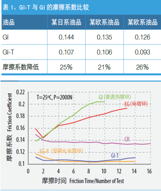 熱鍍鋅鋼板通過T處理可以降低表面的摩擦系數(shù),穩(wěn)定摩擦系數(shù),從而減少汽車廠的模具清潔次數(shù)。(下列性能對(duì)比以GI-T為例)