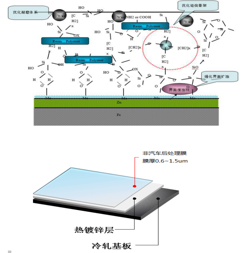 目前湛江冷軋能生產(chǎn)的產(chǎn)品有鈍化、耐指紋以及家電自潤(rùn)滑三種,膜厚從0.6~1.5um不等,綠色環(huán)保,其結(jié)構(gòu)皆以硅烷基來作為骨架,有機(jī)物作為主要填充物,加入性能改良物質(zhì)如表面耐磨劑等改善所需的性能指標(biāo),膜結(jié)構(gòu)圖和斷面示意圖如下: