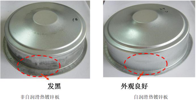 故此自潤(rùn)滑處理后,帶鋼沖壓潤(rùn)滑性能優(yōu)秀,沖壓拉伸面不易變黑,適合無油沖壓,減少了清洗等環(huán)節(jié),與常規(guī)鈍化、耐指紋處理的材料相比,能消除材料的沖壓不良現(xiàn)象,如下圖所示。